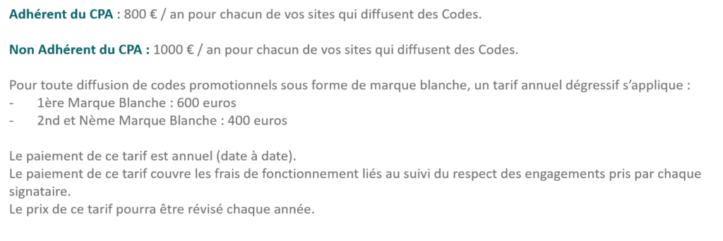 La charte constitue un code de bonnes pratiques relatives au fonctionnement des éditeurs de sites internet ayant pour modèle économique principal la diffusion de codes promotionnels. Elle a pour but d’encadrer les activités des Editeurs quant à la diffusion de codes promotionnels, afin qu’ils proposent une information claire et pertinente, assurent un trafic de qualité aux annonceurs et garantissent une expérience utilisateur optimale (sur desktop et mobile)
