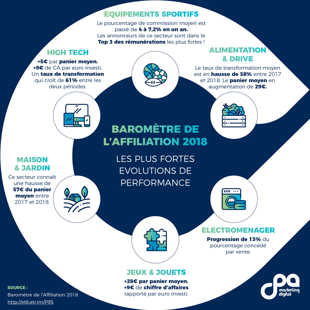 Paris, le 29 janvier 2019 – Le CPA, Collectif Pour les Acteurs du marketing digital, présente le 2ème baromètre de l’affiliation. Cette édition 2018 synthétise et analyse les chiffres de plus de 3000 e-commerçants répartis en 15 secteurs d’activité.