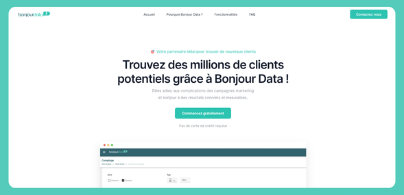 Bonjour Data simplifie vos campagnes de prospection tout en les rendant plus intelligentes et efficaces. Pour dynamiser vos actions marketing et atteindre vos objectifs commerciaux, adoptez Bonjour Data dès maintenant.