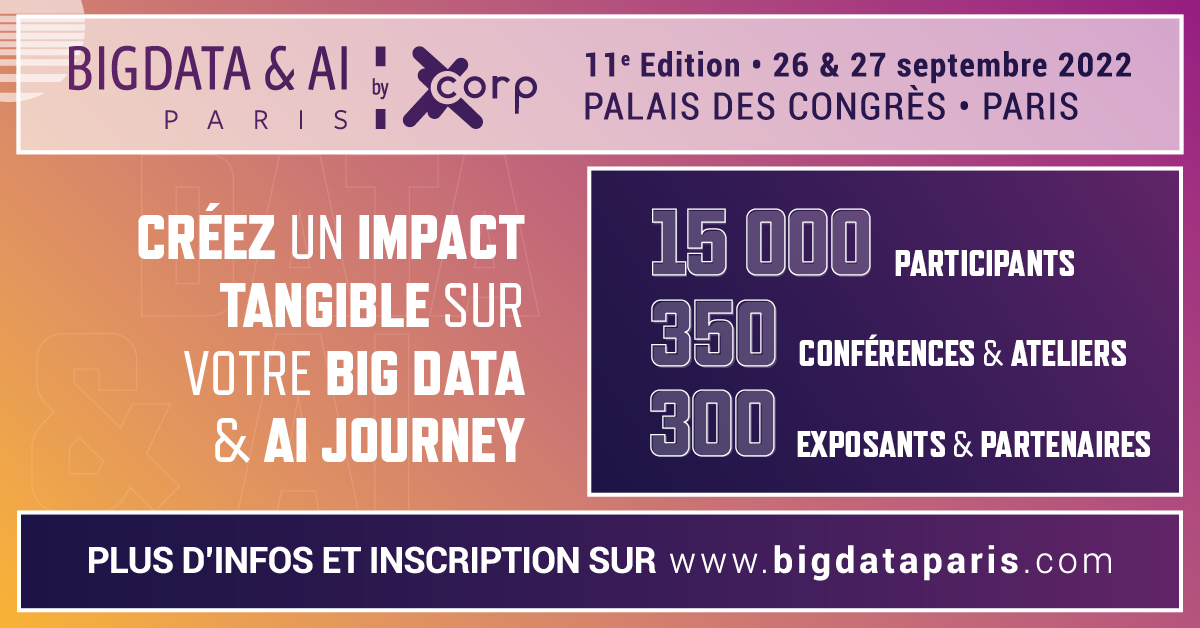 Big Data & AI Paris 2022 est le fruit du regroupement entre deux événements phares de la tech française et européenne : Big Data Paris, rendez-vous clé de la scène big data depuis dix ans, et AI Paris, événement dédié aux avancées de l’intelligence artificielle devenu incontournable en cinq éditions. Rapprochés pour la première fois en 2020, ces deux événements sont désormais regroupés en une seule et unique manifestation, tant le développement des marchés du big data et de l’IA sont corrélés.